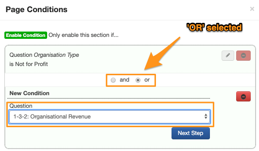 8. The system will then display the existing condition and give the option to make this an AND of an OR condition (system default is set to OR). I confirm that I would like to use the OR option. I will then need to define the question I want the second condition applied to, in this example Question 1-3-2: Organisational Revenue