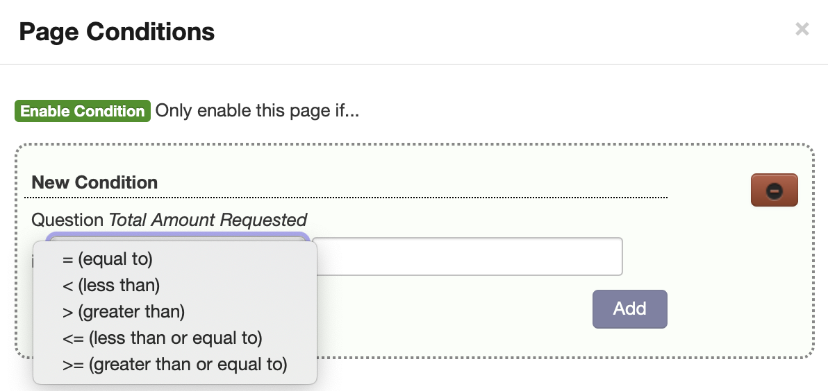6. The choices available for that question will appear. Select which option you want your page or section of the conditional logic to be enabled or disabled by, and set the required value/amount, then click Add. For a number/currency question you will be able to chose from these options and any value/amount (including negative numbers) that you wish.