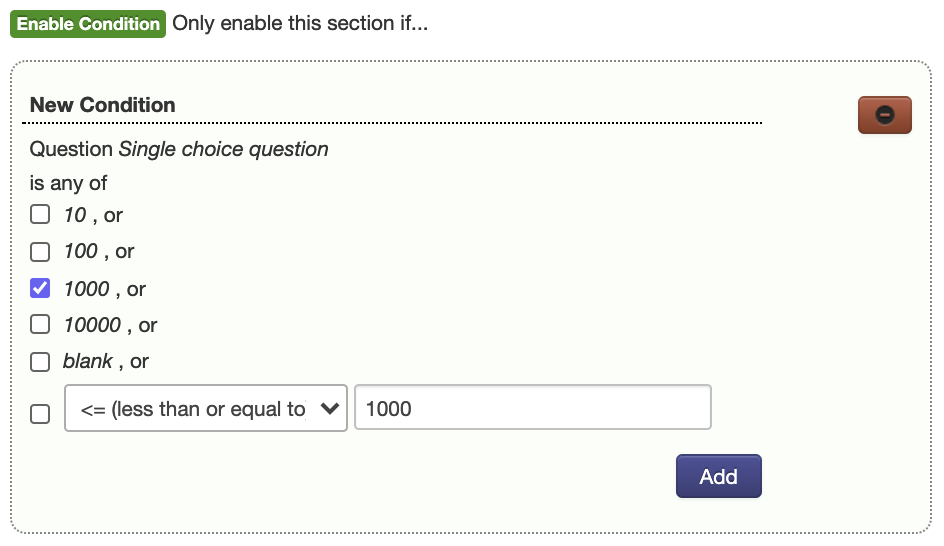 6. The choices available for that question will appear. Select which option you want your page or section of the conditional logic to be enabled or disabled by, and set the required value/amount, then click Add. For a Basic Single Choice question you will be able to set the response that will trigger the condition (in this case '1000'), or the value (also '1000' in this example).