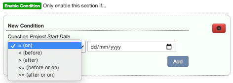 6. The choices available for that question will appear. Select which option you want your page or section of the conditional logic to be enabled or disabled by, and set the required value/amount, then click Add. For a date question you will be able to chose from these options and any date that you wish.