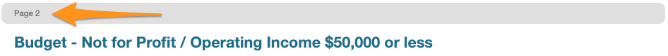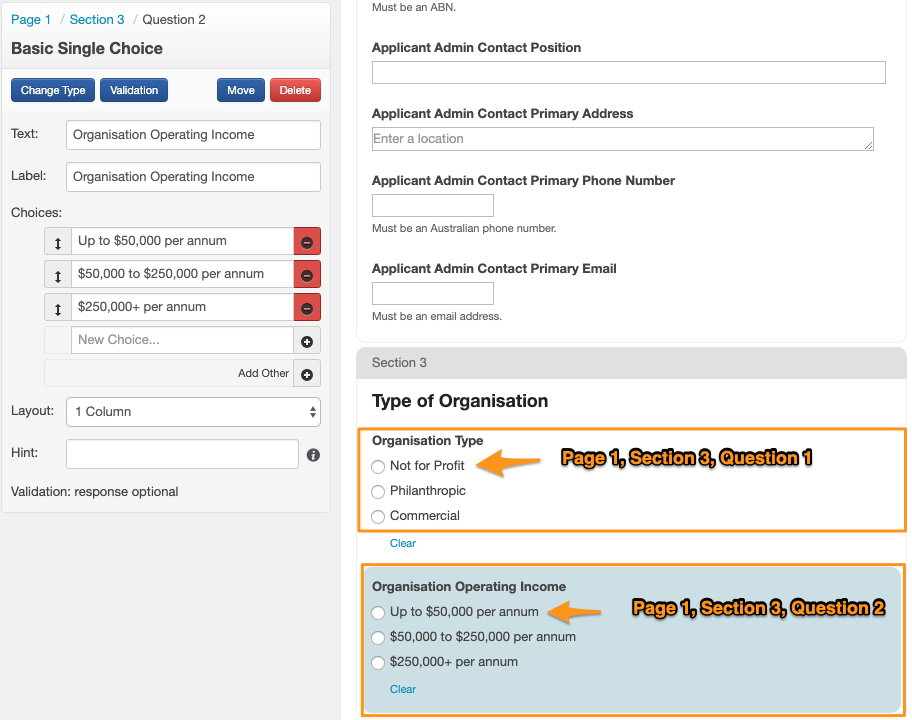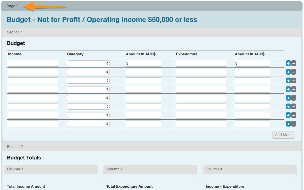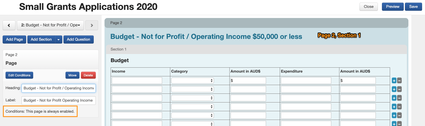 In this next example, we will show how to enable a section or page (in this case a page) based on an applicant selecting multiple responses. In the form we are asking for the applicant's organisation type and their organisations annual operating income. Should the applicant respond that they are a Not for Profit OR that they have an operating income of less than $50,000 per annum they will then have access to a budget information page which has been tailored for these types of organisations.