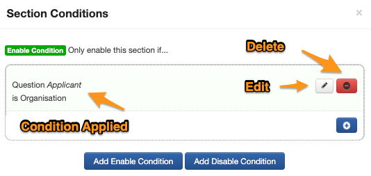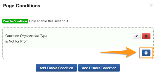 7. At this stage I am able to add another condtion by clicking the Add Enable Condition or Add Disable Condition however, in this example, I want this page to be enabled if the applicant selects either 'Not for Profit' in Question 1-3-1 Organisation Type OR 'Up to $50,000 per annum' in Question 1-3-2 Organisational Revenue OR if they select both responses. To do this I am going to 'nest' the conditions together.