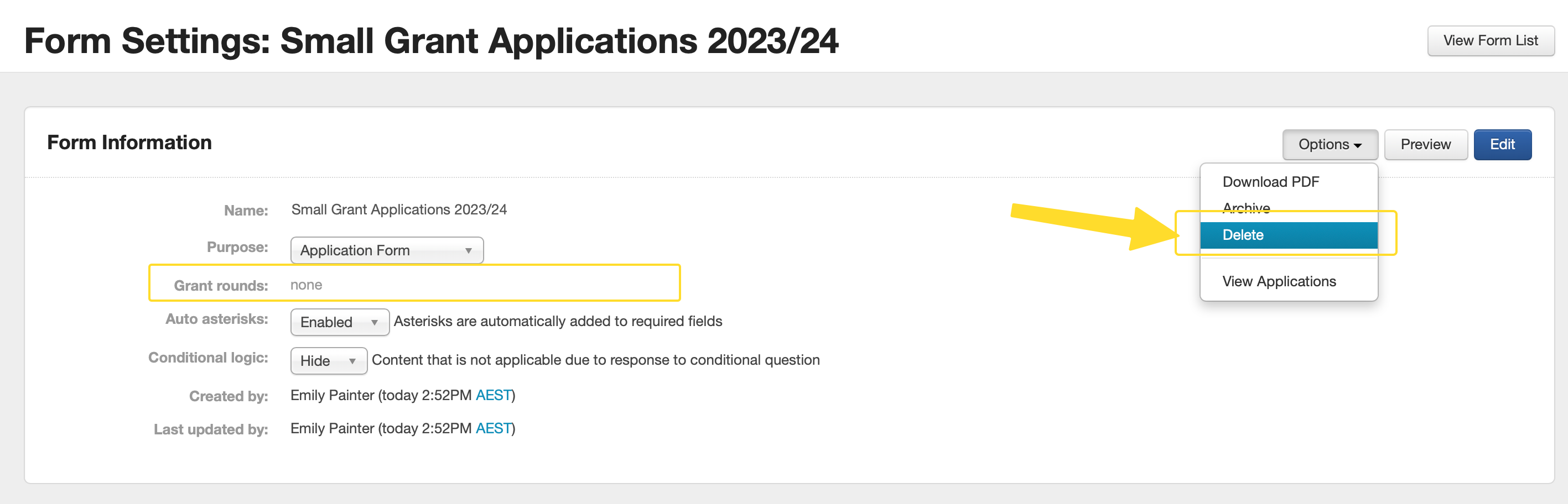 As a manage user you may wish to clean up your forms list and delete a form that has been added in error, or a form that has no responses on it that is not attached to a round.