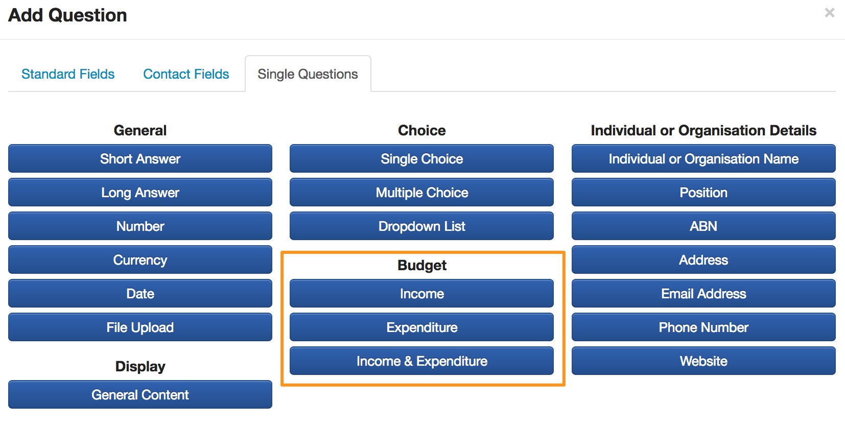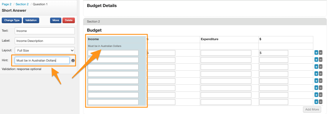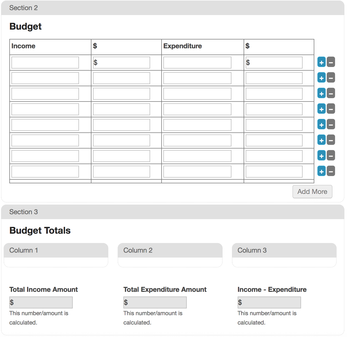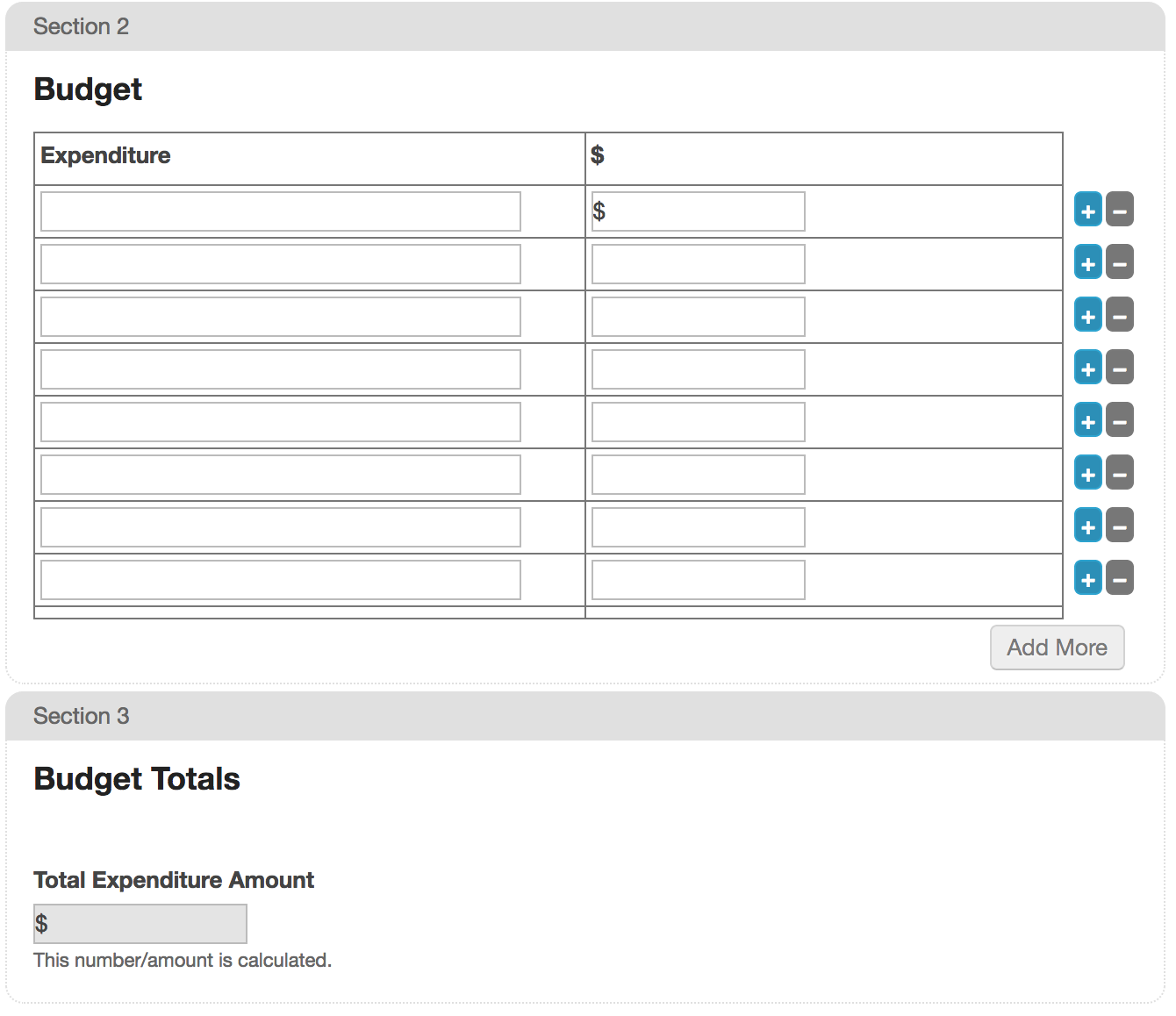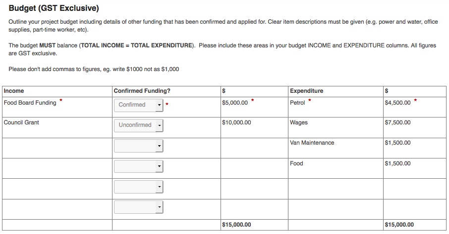 For example, you may want to prompt applicants to give you specific expenditure items such as Salaries, Equipment, Rent or Insurance.