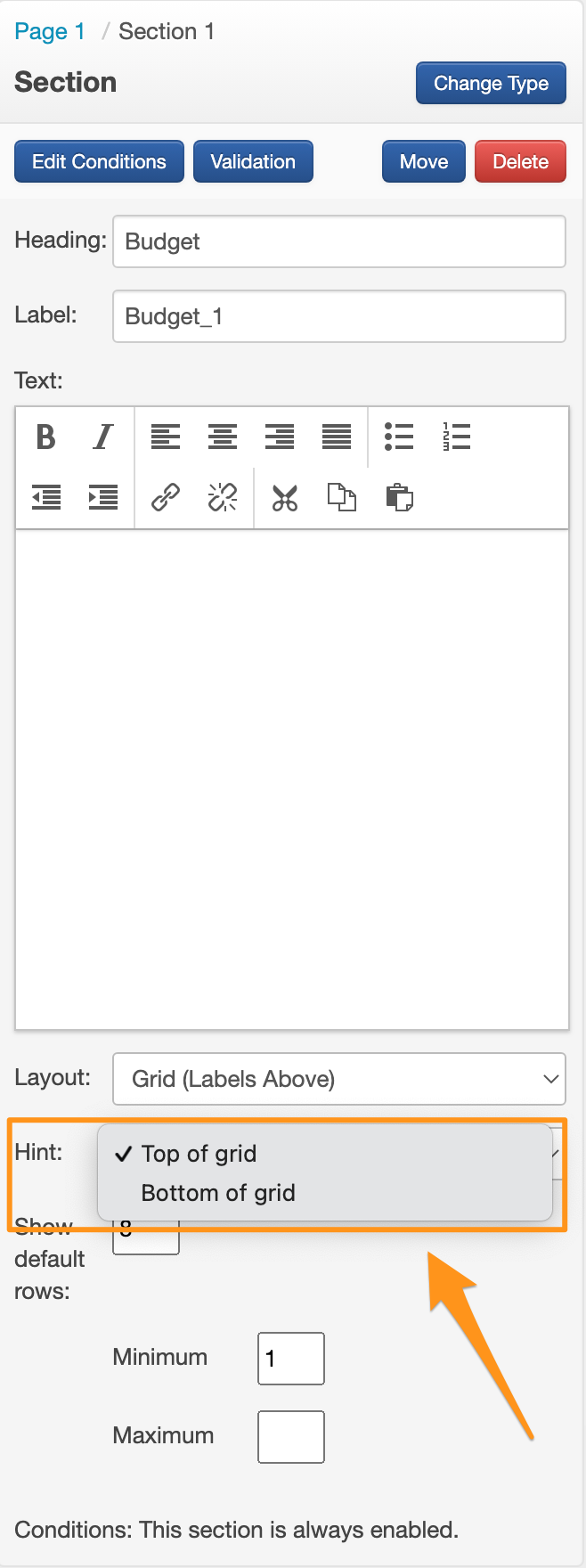 In the contol panel with the section highlighted, choose the hint to be either 'Top of Grid' or 'Bottom of Grid'