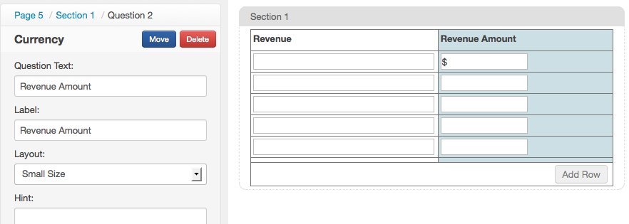 In this example the second question added was a currency question and the question text is entitled 'Revenue Amount'.