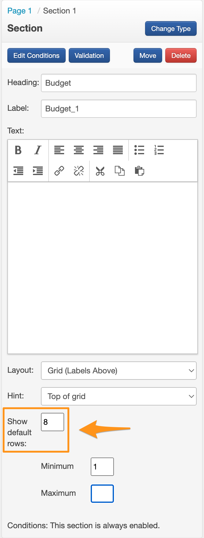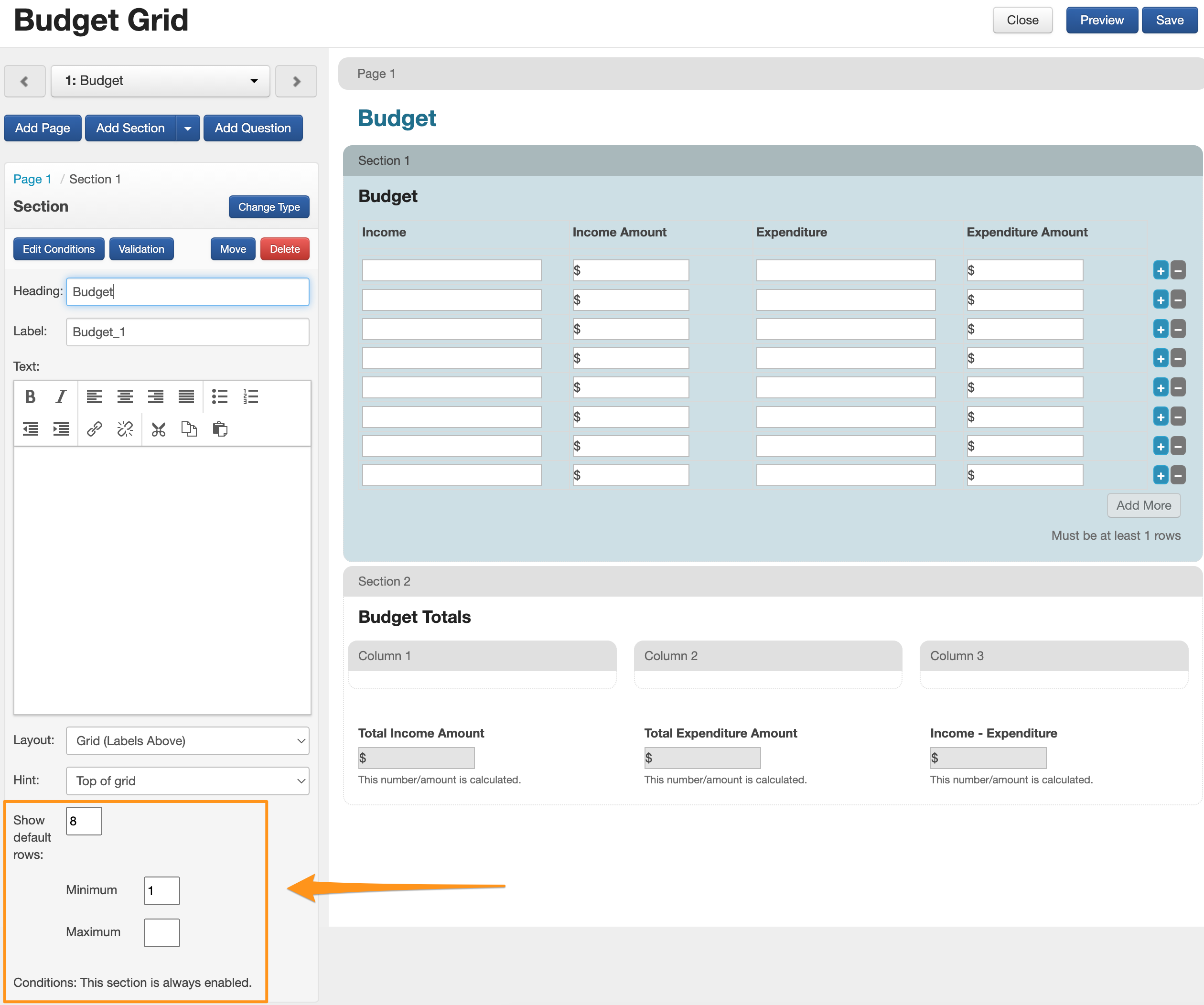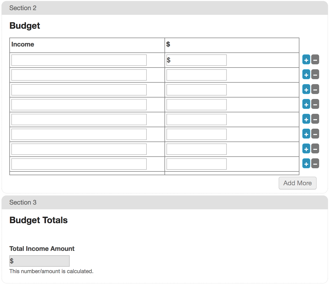 This article explains the single question default budget grids as well as using grid sections in general. Note that there are also default standard section budget grids that can be added to forms. Please see How do I add standard sections to forms? for more information.