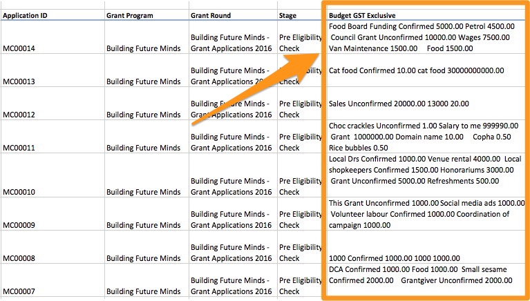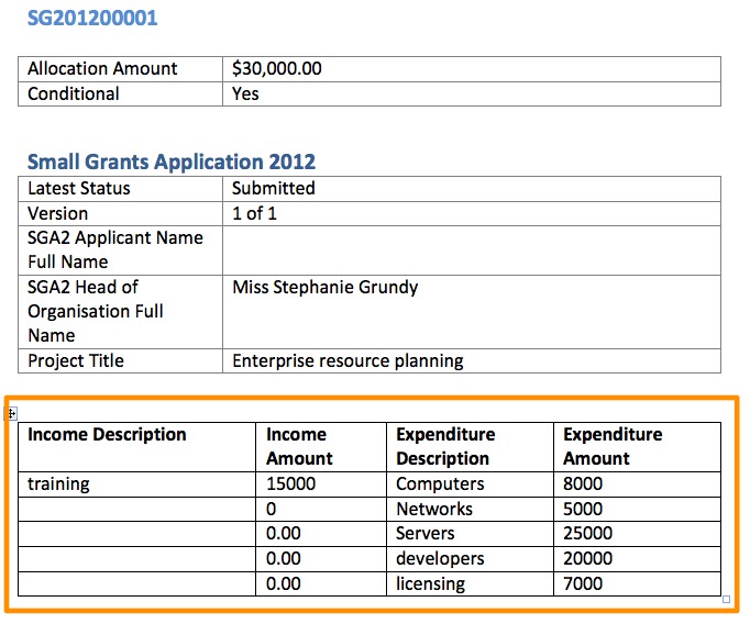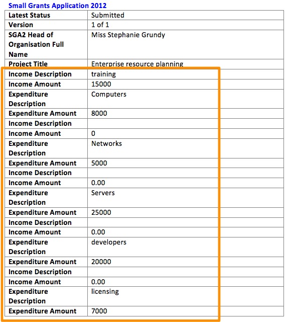 It is important to note that there are limitations on the layout appearance of grids in reporting, particularly in Microsoft Excel, Microsoft Word however, allows you to customise your grid in more detail. Below is an example of how a budget grid has been created and filled in by the applicant on a form and then how it is displayed in an excel report.