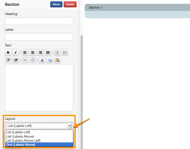 Within a new section of your form, click on the layout drop down arrow in the left hand form panel. This will bring up 4 different options, select Grid (Labels Above) option.