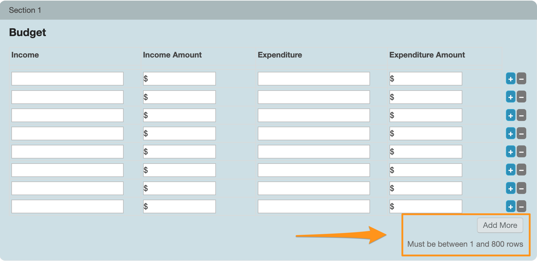You have the ability to define how many rows your applicants may enter or give them the ability to add as many rows as needed.