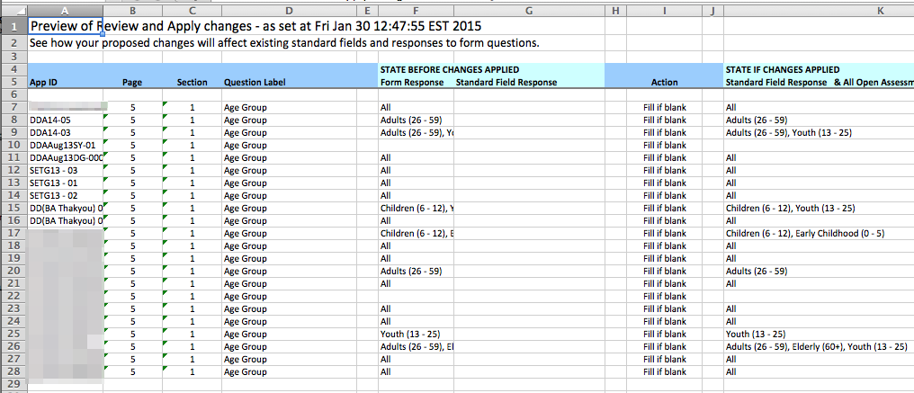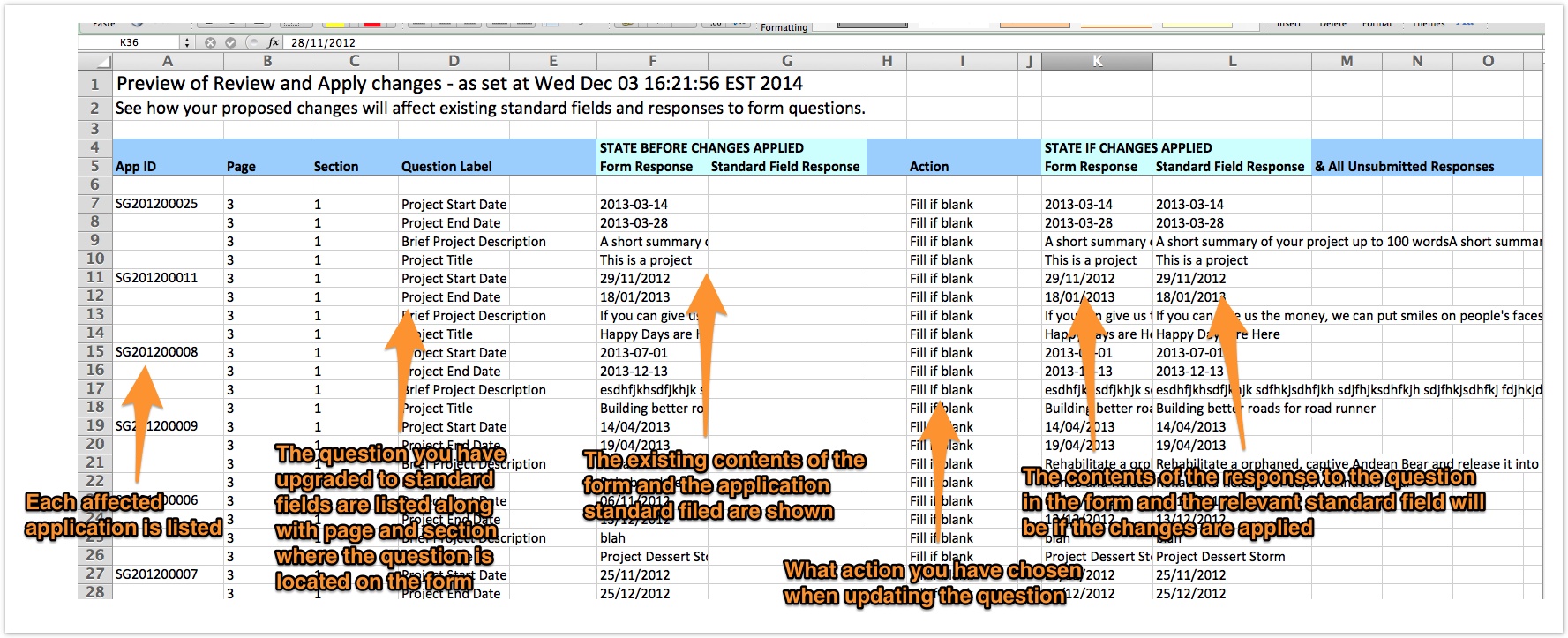 To view the impact of your choices you can generate a spreadsheet showing the changes, by clicking on Generate Spreadsheet and once the spreadsheet is ready Download. This spreadsheet will demonstrate to you what will happen to response to the question and to standard fields if you apply the changes. Refer to the screenshot below for an explanation of the spreadsheet.
