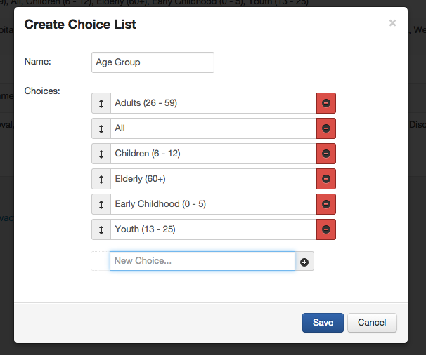 You must first create a choice list that holds all of the values you will want accessible under your standard field. This will generally correspond with the choices available in your form; however, if you are updating a number of forms to use the same standard field you might find that the choices in the form vary. For example if you had a choice list relating to Australian states, some forms might refer to 'New South Wales' and others might refer to 'NSW', you will need to decide what the consolidate list of choices should be an then create the corresponding choice list.