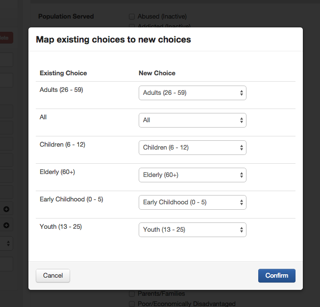 Mapping existing choices give you the chance to iron out slight variations in choices across forms. For example if you had a choice list relating to Australian states, some forms might refer to 'New South Wales' and others might refer to 'NSW'. When upgrading questions you will be able gain consistency in the way you refer to choices.