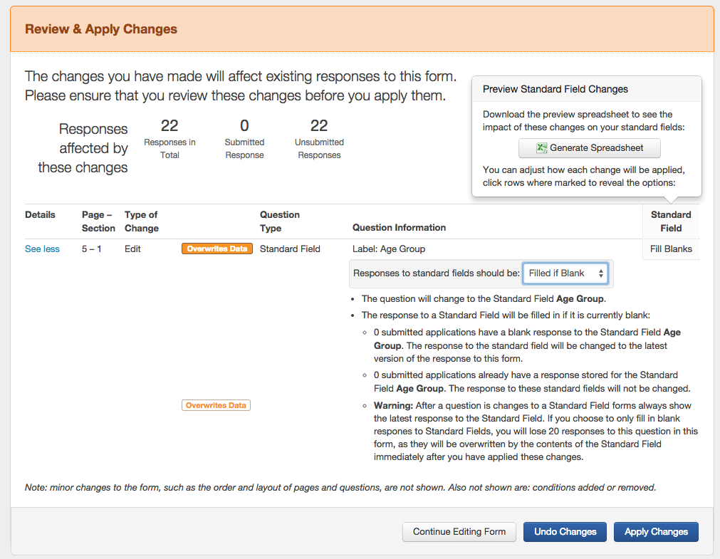 The Review and Apply Changes gives you an important summary of the impact of the changes you have made to your form and how they will affect applications and responses that rely on the form your are editing.