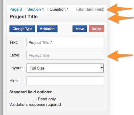 The change to a standard field will be reflected in the question properties bar. Their will be a notation that the question is a (Standard Field), the question type will be changed to the name of the Standard Field and the question label will be locked.