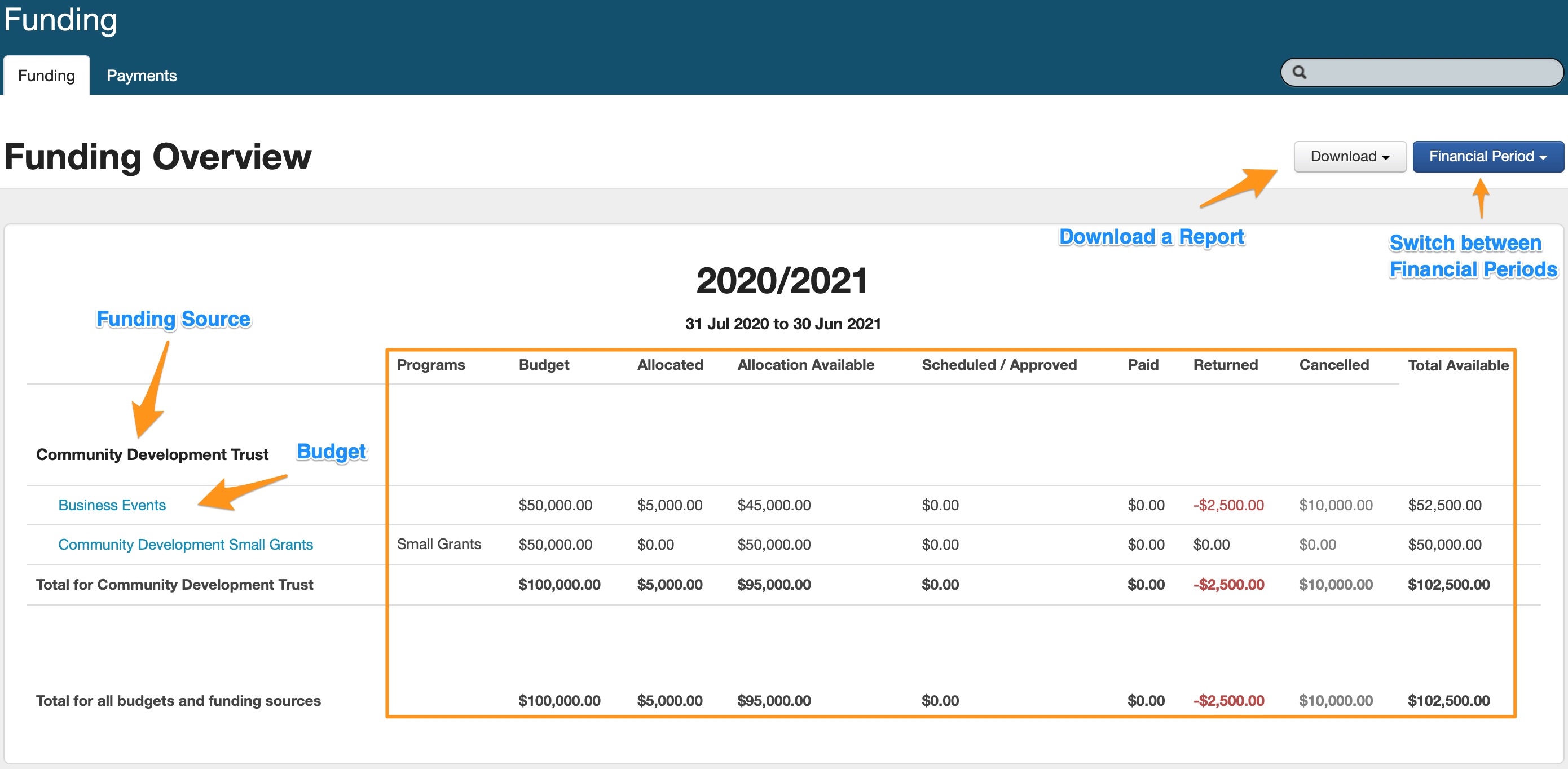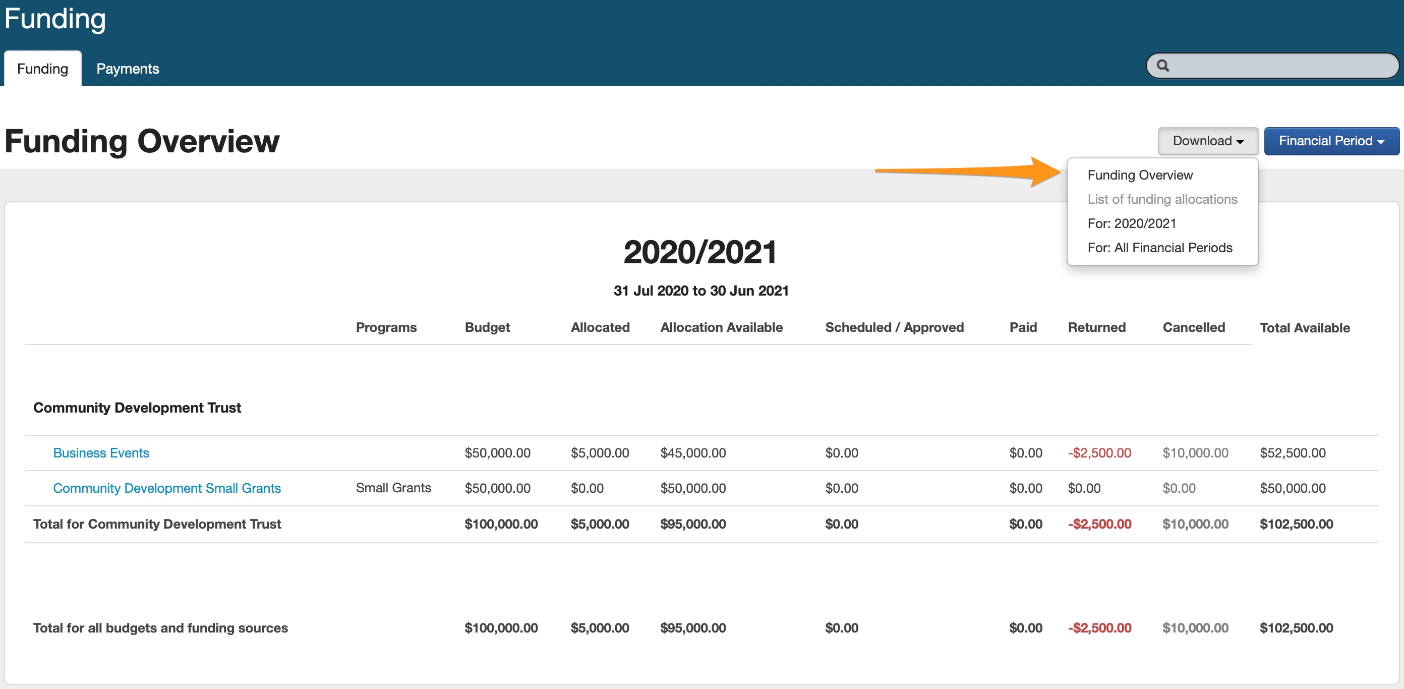 From this page you can export funding allocations into an Excel Spreadsheet. Click on Download and then select the current Financial Period, or All Financial Periods generate a report. You are also able to download a Funding Overview snapshot report from the Download button.For a further breakdown of each budget (highlighted in blue), click on the budget. This will give you a listing of all applications that have been funded out of that budget financial period, and how much money has been allocated, scheduled/approved, paid, returned and allocation available for each application against that budget.