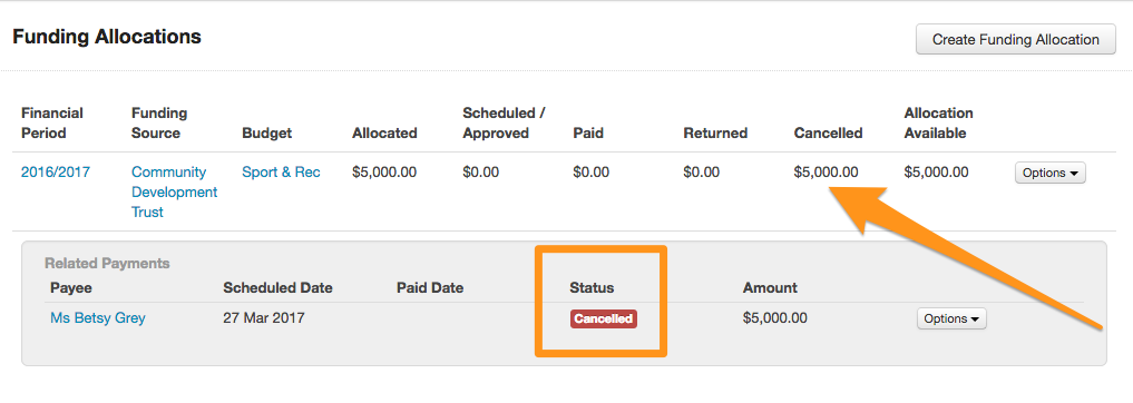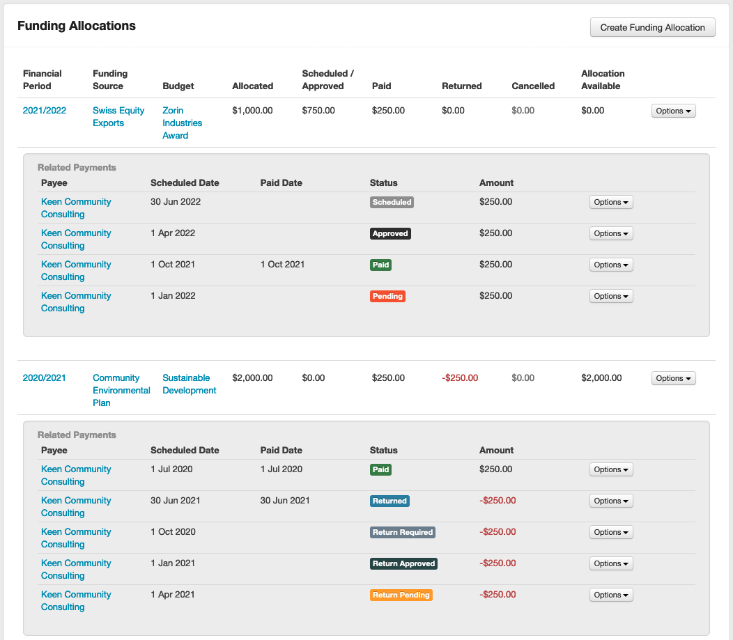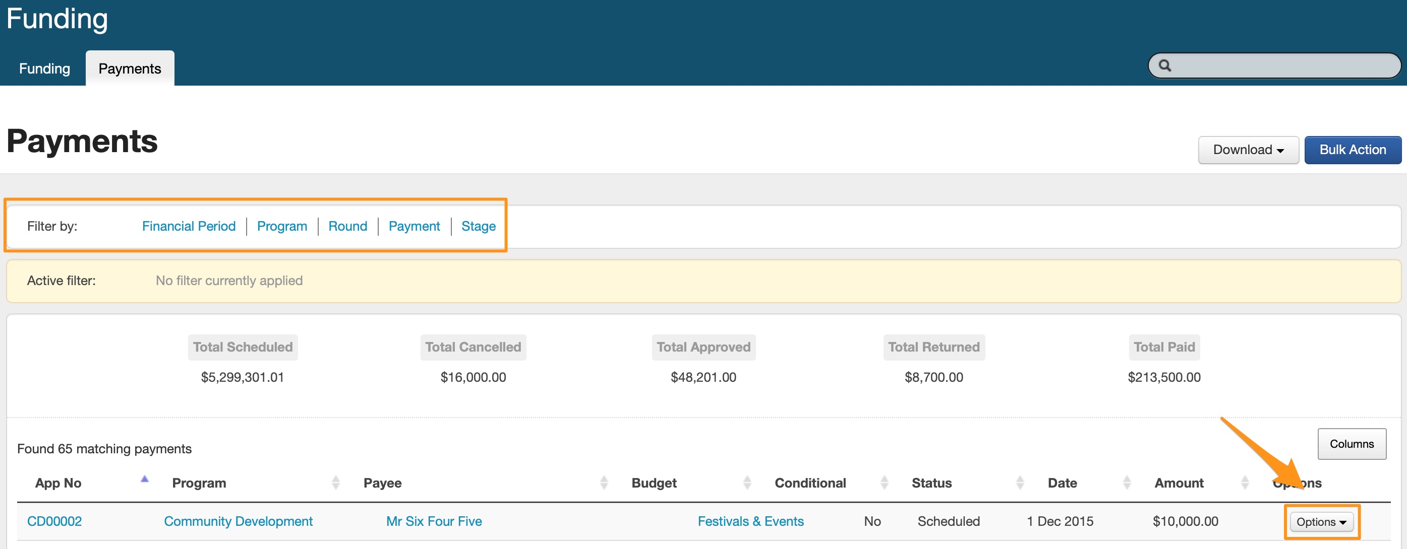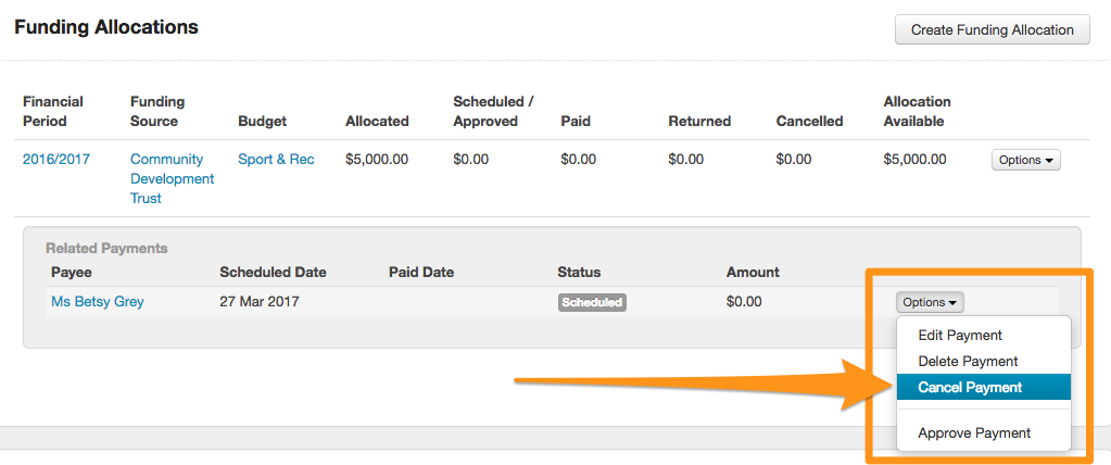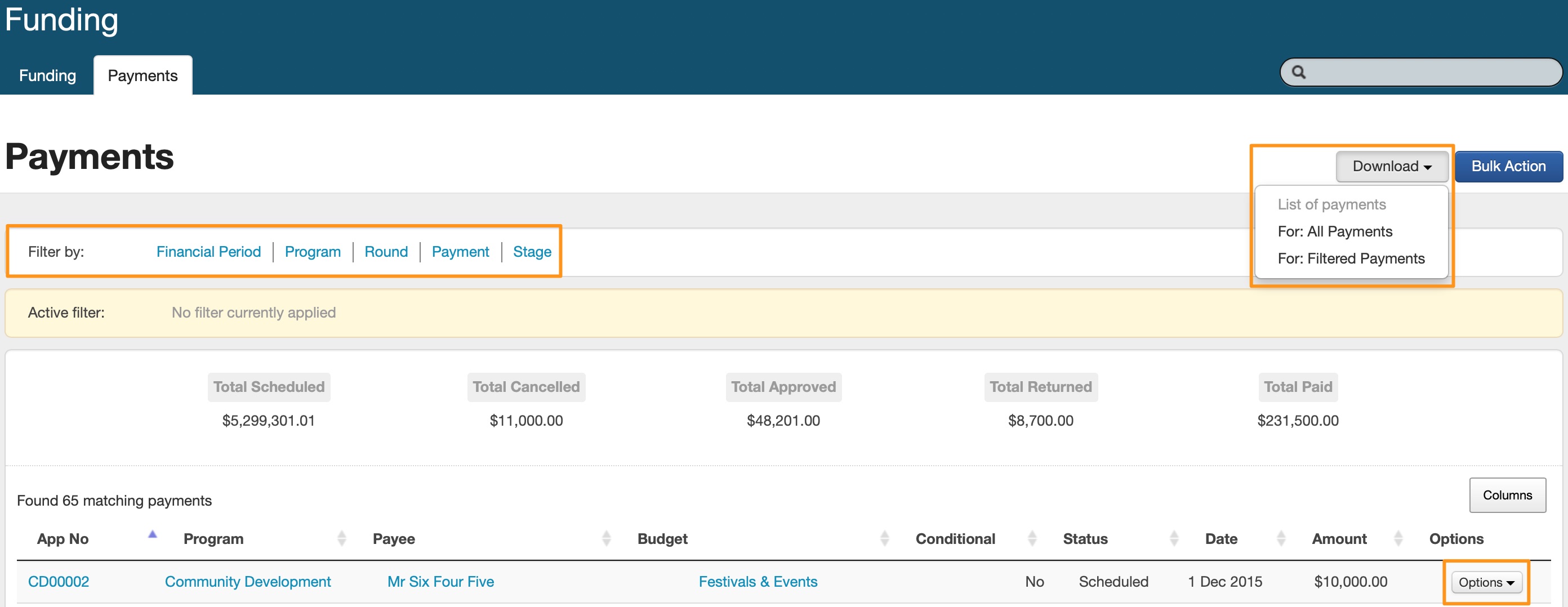 From here you can click on the Options button to edit or delete an allocation. You can also export this information into an Excel Spreadsheet. Click on Download and then select the current Financial Period, or All Financial Periods generate a report of funding allocations for this budget.For an overview of all allocations either Scheduled, Approved, Paid, Cancelled or Returned, click on the Payments tab. Through this tab you can also filter payments by Financial Period, Program, Round, Payment or Stage and can click on Options to change the status of allocations from "Scheduled" to "Approved" and to "Paid", you may also "Cancel" a payment.