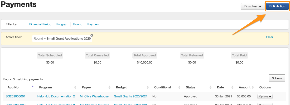 When using the 'Change Payment Status' bulk action you will have the ability to 'skip' a status. When recording a payment on an individual application, the payment will start with the status 'Scheduled', then 'Approved' and then finally 'Paid'. It is important that you are aware of this as payments may need to be approved by another person. Please consider this when formulating your payment recording process.