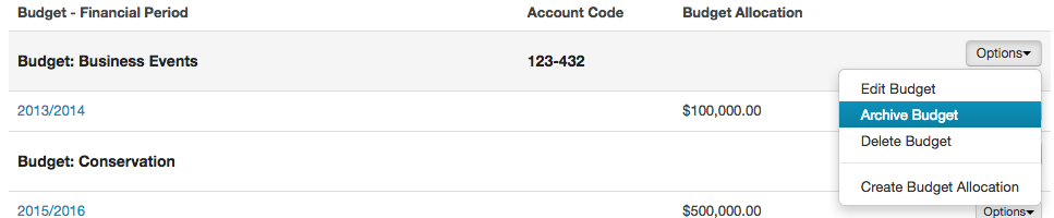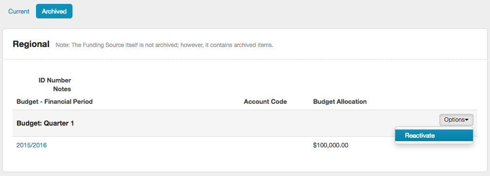 Please note: when a budget is archived it is not possible to add a funding allocation to that budget. When a funding source is archived it is not possible to add a funding allocation or a new budget.