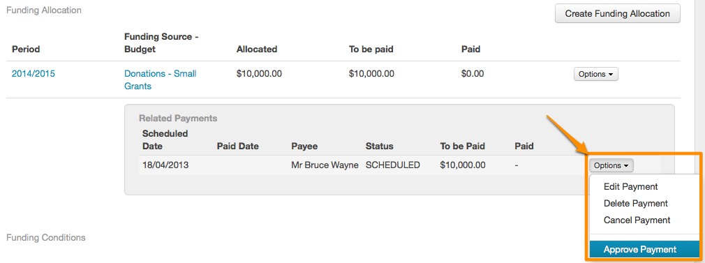 Once a funding amount has been allocated, you can also approve and record your payments through SmartyGrants' funding area.