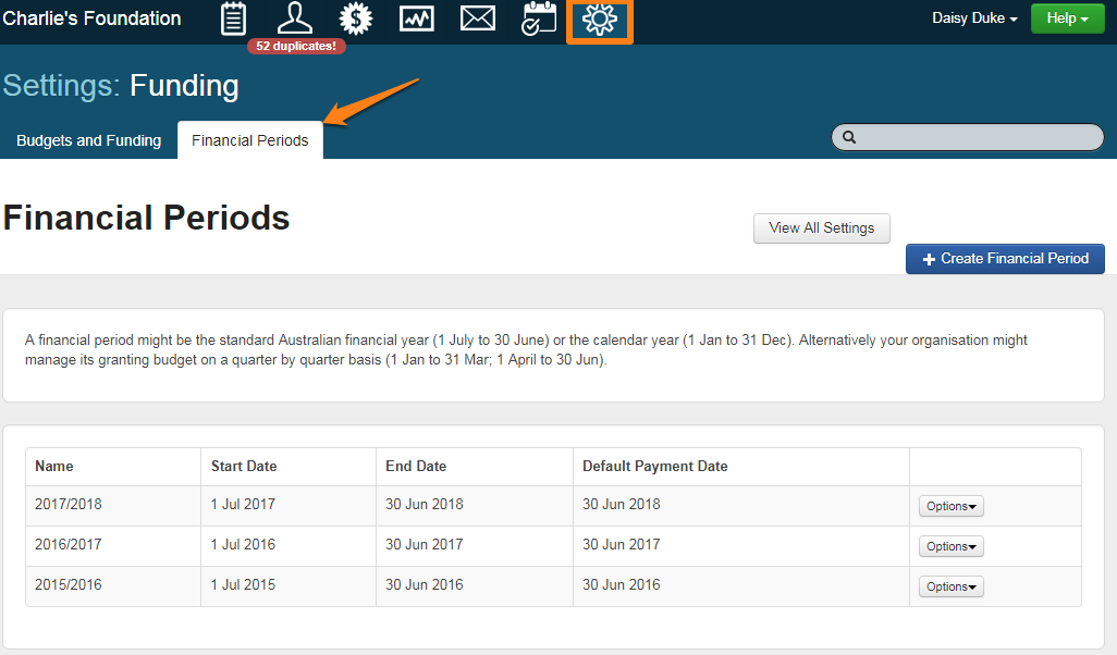 A financial period might be the standard Australian financial year (1 July to 30 June) or the calendar year (1 Jan to 31 Dec). Alternatively your organisation might manage its granting budget on a quarter by quarter basis (1 Jan to 31 Mar; 1 April to 30 Jun).