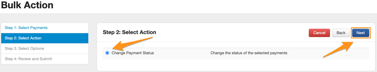 You will then be prompted to select which Bulk Action you would like to apply. Currently only one Bulk Action is available for Payments and it is the 'Change Payment Status'. Clicking the radio button to the right will select this Bulk Action. Clicking the 'Next' button will take you to the next step.