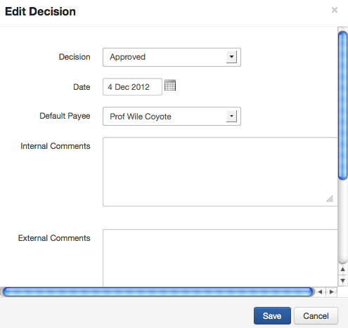 At this stage you can also add any internal or external comments, as well as any funding conditions that may apply. When you are happy with your entry, click Save.
