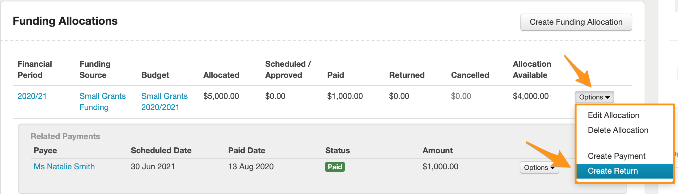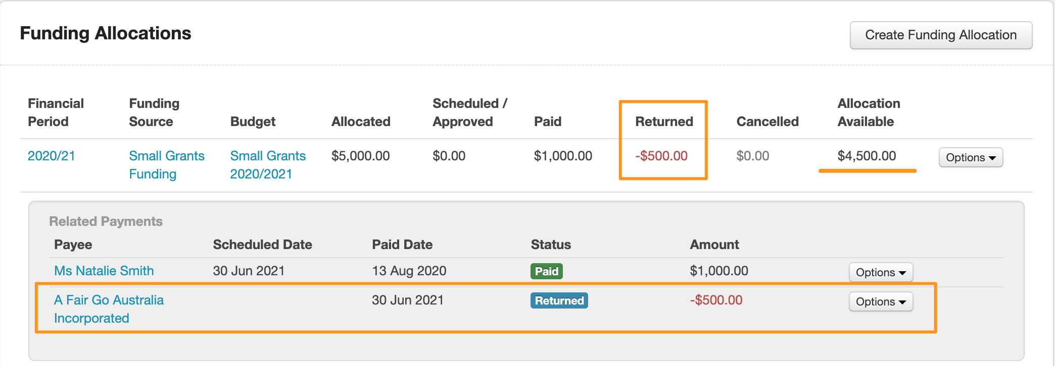 The amount returned will be recorded beneath the paid line. The Allocation Available will now reflect the difference between the paid amount and what has been returned.