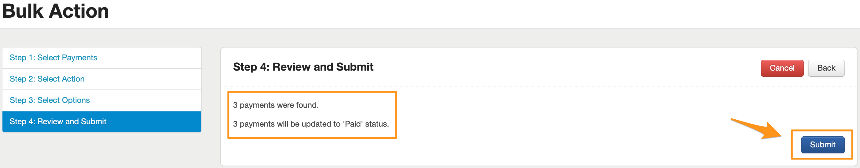 You will then be taken to 'Step 4: Review and Submit'. You will be given a summary of the changes that the Bulk Action will make. Once you are satisfied that this is correct, click the 'Submit' button in the bottom right corner.
