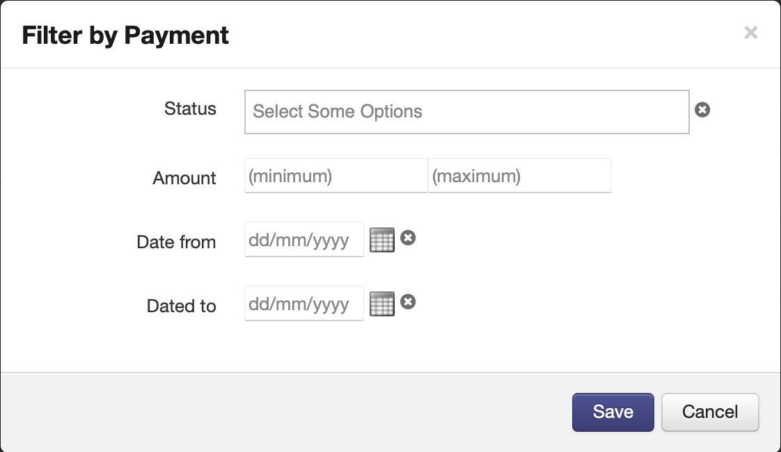 Payment - allows the User to filter by payment status, minimum or maximum amount and date created (before or after a specified date)