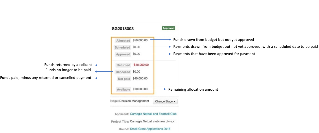The funding section of SmartyGrants gives you a quick snapshot view of your budgets, and the payments you have allocated, scheduled, approved and/or paid, returned or cancelled. All of this information can also be compiled into reports using SmartyGrants' reporting area.