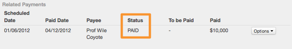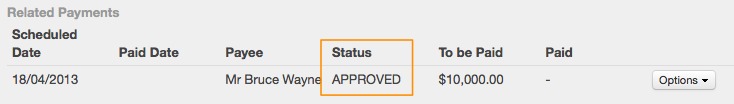 Once the payment has been marked as approved, you will see its status is also marked as approved. You can return to this page at any time and record that the payment has actually been made. When you are ready to record the payment, click back into the Options button and choose Record Payment.