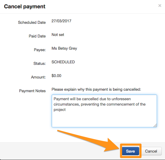 Record an explanation for why the payment is being cancelled and click on Save to confirm.