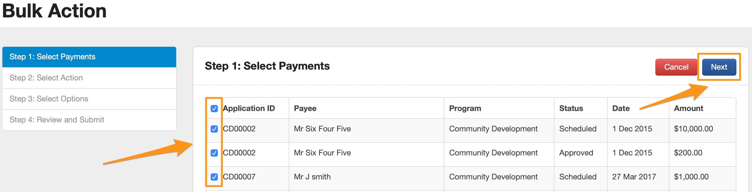 Users with access to Funding and Payments are able to utilise a Bulk Action to change the status of a payment. This function is available from the Payments tab under the Funding and Payments icon.