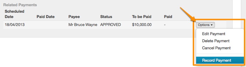 3. Click on Options against the relevant payment, here you can choose to approve, edit and record payments.