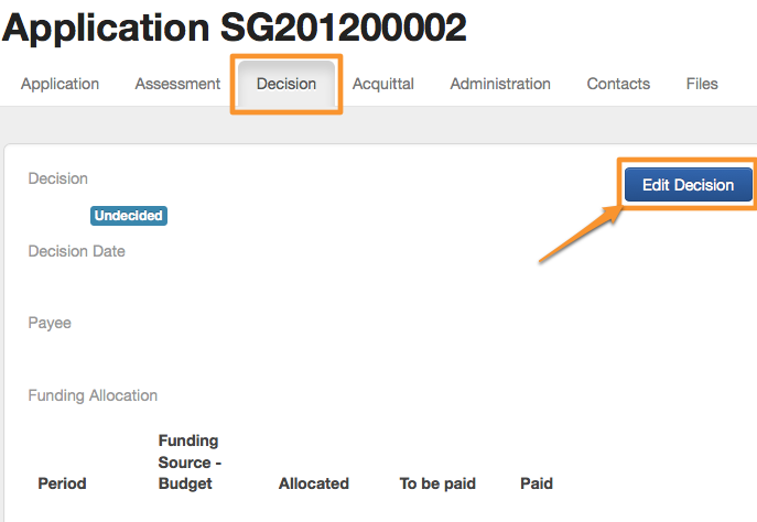 When you are ready to approve and make a payment you need to visit the Decision tab on the relevant application. Your allocated funding amounts will appear on the page.