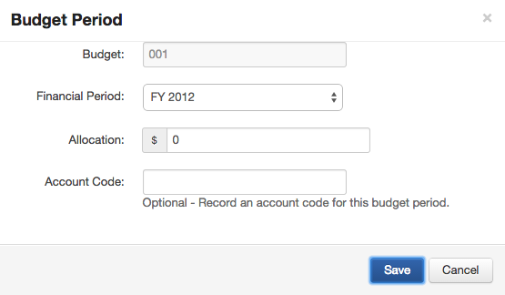 Select the Financial Period, Allocation and optional Account Code, then click Save. The amount that you enter relates to the budget amount for your whole financial period.