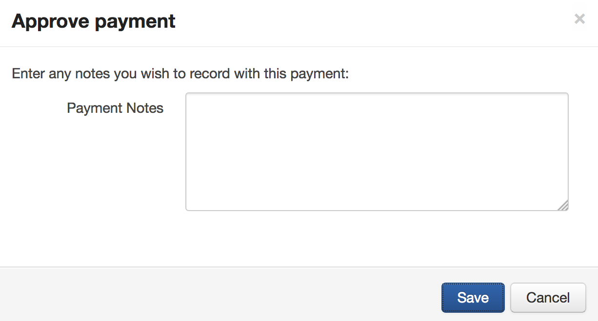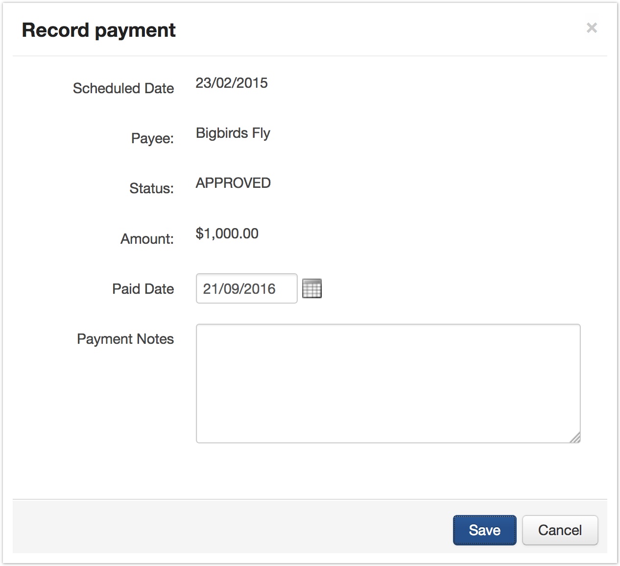 A window will appear, in which you can amend the payment date and enter any payment notes you wish to record. Once you are done, click Save.