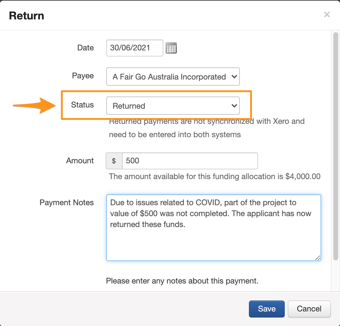 Enter details of the returned payment, the system will automatically assign the Returned status.