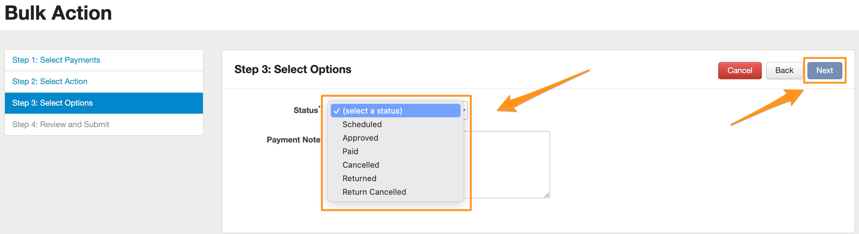 Next, you will select the Status that you would like the Bulk Action to change from the dropdown list. You are also able to enter any Payment Notes that may be required in the field below the drop down list. When the Status has been selected, and any Payment Notes added, click the next button in the top right hand corner.