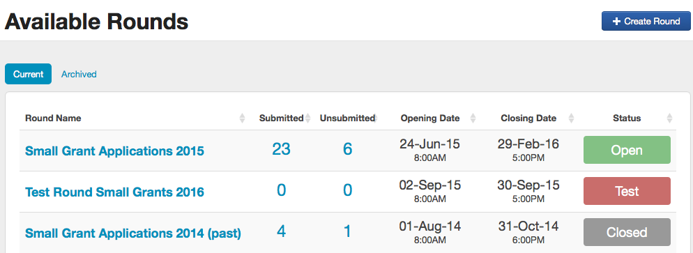 Over time grant rounds will begin to accumulate in a grant program. For the old rounds that are not complete you can choose to archive these rounds. Archiving a round does not affect what you can do to any of the applications in the round.