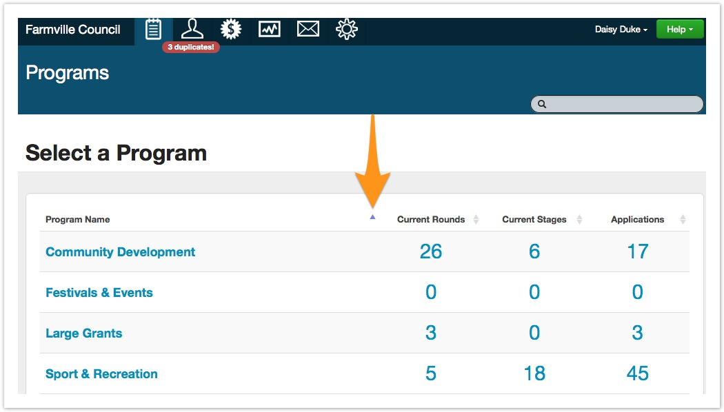 In Smartygrants you can sort your rounds by using the arrows in the title bar to adjust your preferences. Rounds are sorted numerically and only applied to current rounds ie: not those rounds that have been archived.