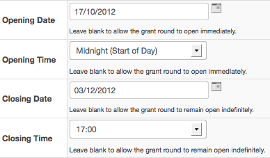 In SmartyGrants, you can define grant rounds with a start and finish date and time, or you can leave them open-ended. Applicants can only lodge online Applications during the specified period.
