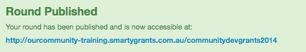 Publishing a Grant Round does NOT open it. Publishing the Grant Round simply makes it visible to Applicants visiting your SmartyGrants site. The Apply Now button does not appear until the opening date you have specified.