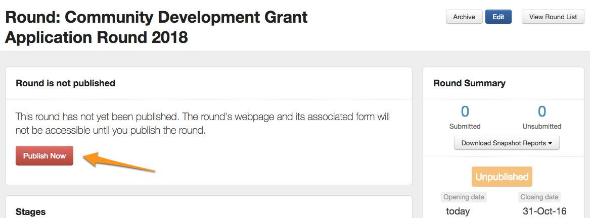 When you are ready to make the Grant Round webpage and Form publicly accessible click on the red 'Publish this round' button. Should you have not yet attached your application form, you will not see the red ‘Publish Now’ button. You will need to attach an application form to the round before the round is able to be published.