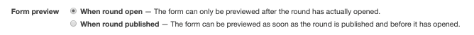 You can configure whether applicants can preview your form prior to the grant round actually opening. Your form can always be previewed once the round has opened; however, you may want to allow people to preview the form from when you publish the round so that they have additional time to prepare a submission. Please note, you will not be able to publish a round until there is an Application form attached to the round.