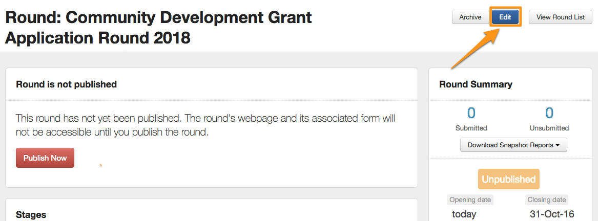 Your round will be created in an Unpublished state, which gives you the opportunity to tweak any of the settings before publishing it. If you wish to make any changes to the settings at this point you can click on 'Edit'.