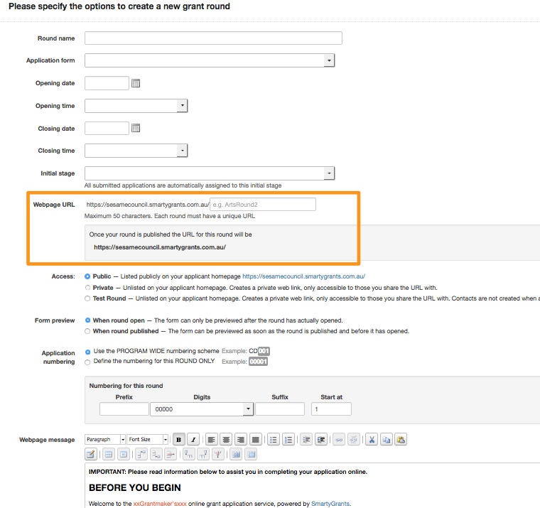 Anytime you create a new Grant Round you will be asked to type in a Website URL extension that is unique for that particular Grant Round.