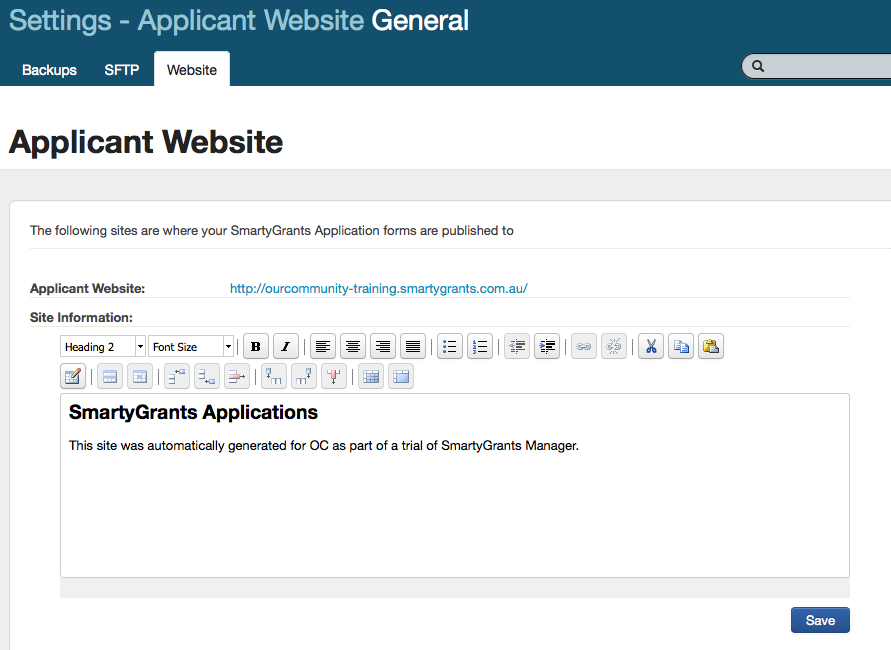 This applicant site will have the look and feel (skinning) of your own website but is hosted by SmartyGrants.