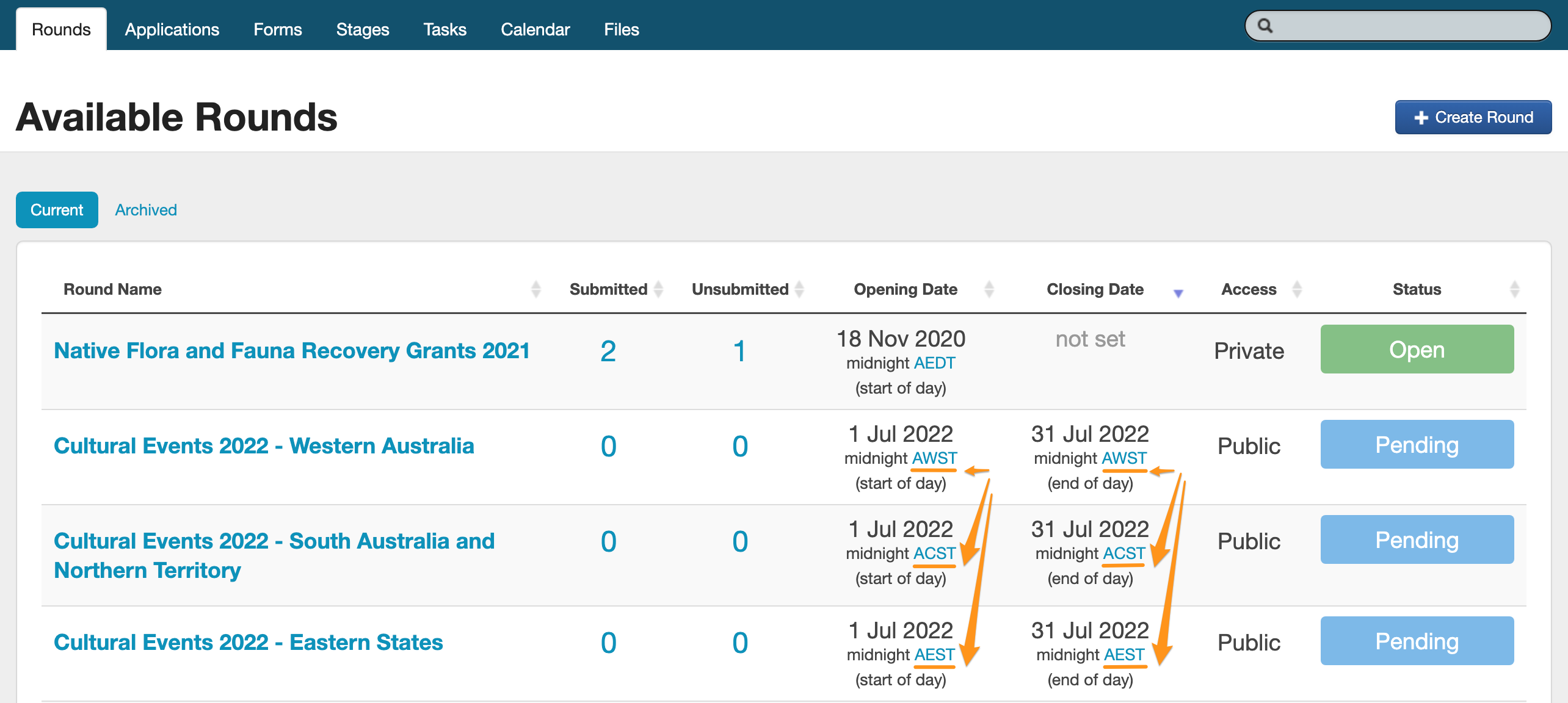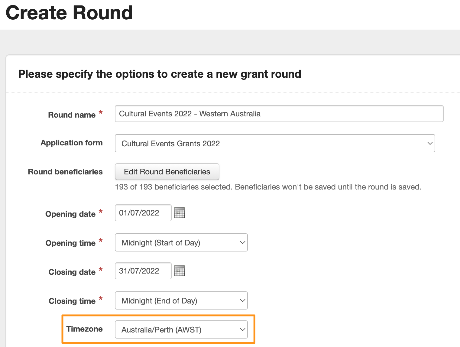 We are running a Cultural Events grant round in Australia. We will set up a round for each of the three most populated timezones that are in effect across the country. When creating the round we will select the relevant time zone option from the ‘Create Round’ screen.